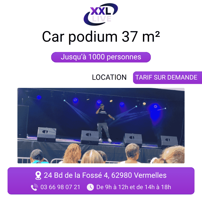 La location car podium 37 m² XXL Live est la solution clé en main pour les événements extérieurs qui ont besoin d’une vraie scène : 37 m² de surface couverte, sono et éclairage intégrés, déployable en quelques heures sans infrastructure préalable.