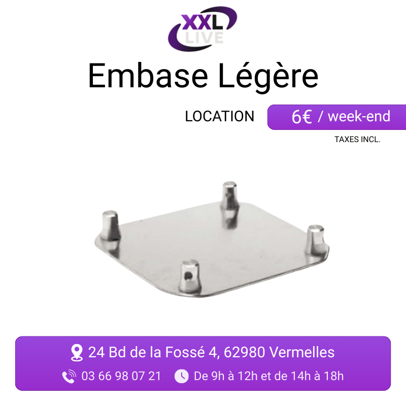 La location embase légère truss XXL Live fournit la base de stabilisation indispensable pour ancrer vos poutres verticales au sol, avec une conception compacte et légère pensée pour les installations en intérieur sur surface plane.